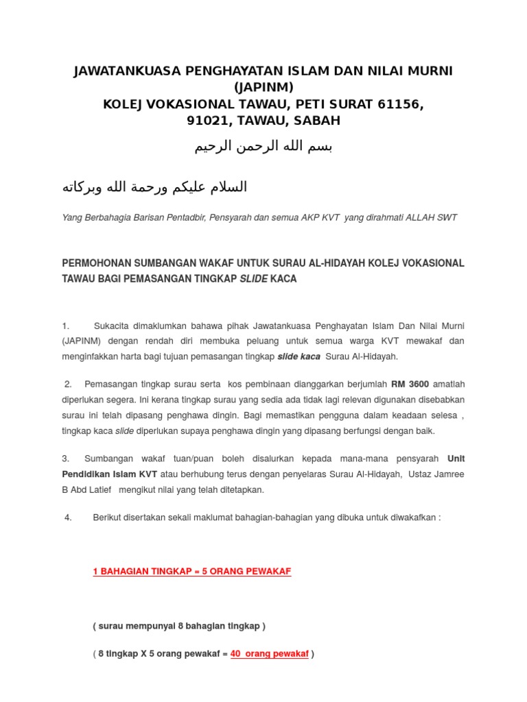 Surat Mohon Sumbangan Wakaf Tinkap Surau Pdf